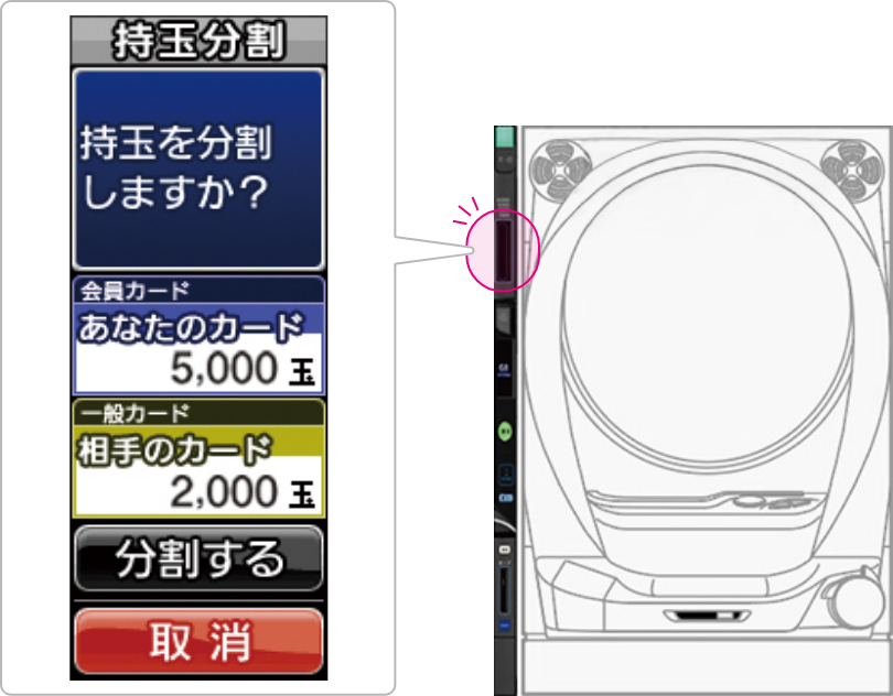 例えば、7,000玉ある自分の持玉を、相手に2,000玉渡したい場合、一般力一ドへ持玉を分割させることができます。